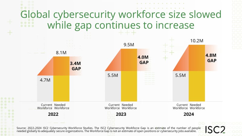 In 2024, cybersecurity professionals have faced a variety of issues that impacted roles and responsibilities across organizations of all types. Economic pressures, global geopolitical issues, supply chain disruptions, failed software updates and increasing automation and digitalization of cybersecurity tasks have brought into focus the business-critical nature of cybersecurity and allowed professionals to showcase their skills and expertise protecting organizations. However, despite both the clear need and the recognition of the value cybersecurity adds to organizations, the global active cyber workforce has stalled at 5.5 million people.