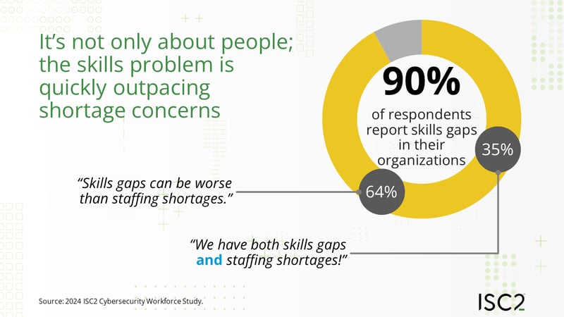 As our research has revealed, 90% of those surveyed indicate skills shortages in their organizations, with two thirds (64%) viewing these shortages as more serious than the personnel shortages they are dealing with, while the remaining third places skills and people shortages on an equal footing in terms of criticality. While the workforce must continue to grow, particularly through the hiring of entry- and junior-level staff in order to deliver the next generation of cybersecurity professionals, upskilling and multi-skilling are essential to meeting the needs of employers and their current and evolving cybersecurity roles.