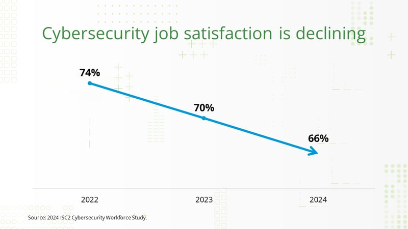 Furthermore, alongside stalled growth in the active workforce, year-on-year comparison shows that the traditionally high level of job satisfaction found in the cybersecurity sector is down 4%. However, with 66% of participants still satisfied with their role, this is something that employers can leverage to recruit new people into the profession, if job opportunities are made available.